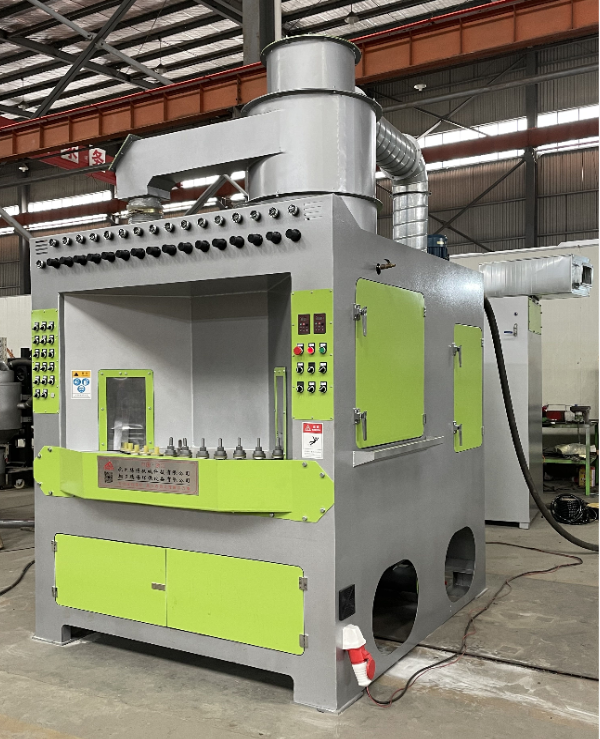該自動噴砂機(可按客戶要求定制),主要用于處理回轉體工件的自動噴砂機,設1個大轉盤,大轉盤上設置8個小轉盤,針對小直徑工件可在小轉盤上設置復合多工位小轉盤,本機共分4個區,分別為上下件區、第一隔離區、噴砂區、第二隔離區(吹凈區),每個區設兩個小轉盤,大轉盤轉動90°區域一停,工件由上下件區裝夾在小轉盤上,大轉盤轉動帶動小轉盤和工件進入噴砂區,小轉盤在噴砂區自動旋轉,噴槍往復擺動或移動對工件進噴砂加工,保證了工件噴砂均勻;配置我公司多年經驗專業設計的上旋風分離器,分離效果好,精度高,無級可調;配置獨立的氣動振打清灰布袋除塵器,也可根據用戶要求配置下沉流脈沖反吹清灰濾筒除塵器,除塵效果好,達到國家環保排放標準;本機采用成熟可靠的先進技術。